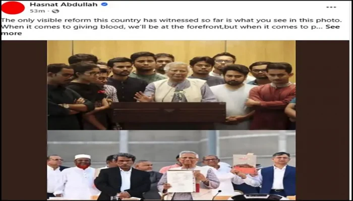 গত বছরের ৫ আগস্ট আওয়ামী লীগ সরকারের পতনের পর সরকার গঠনের দায়িত্ব নিতে দেশে ফিরলে ড. মুহাম্মদ ইউনূসকে বিমানবন্দরে স্বাগত জানিয়েছিল বৈষম্যবিরোধী ছাত্র আন্দোলনের সমন্বয়করা। সেদিনের একটি ছবি এবং শুক্রবার জাতীয় সংসদের দক্ষিণ প্লাজায় জুলাই সনদ স্বাক্ষর অনুষ্ঠানে প্রধান উপদেষ্টার একটি ছবি পাশাপাশি যুক্ত করে হাসনাত আব্দুল্লাহ বলেছেন, এই দেশে এখন পর্যন্ত চোখে দেখা যায় এমন একমাত্র সংস্কার হলো এই ছবিতে যা দেখা যাচ্ছে।